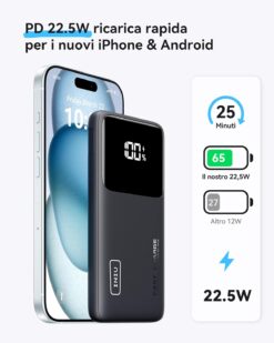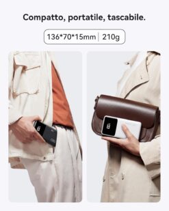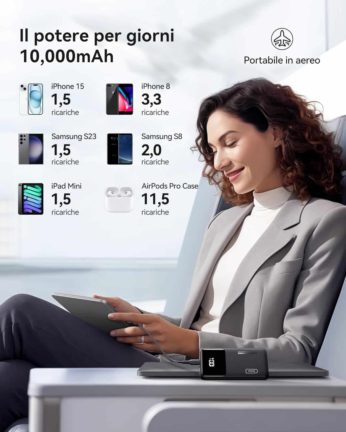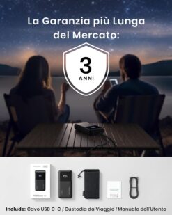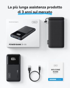 1x Power Bank 10000 mAh, 1x cavo USB-C, 1x manuale d’uso, 1x custodia da viaggio, garanzia 2 anni leader del settore e supporto tecnico a vita.