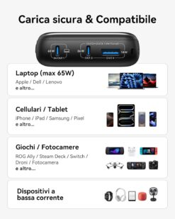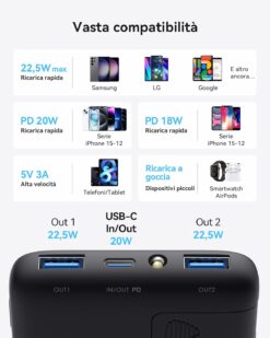 A differenza della maggior parte dei power bank che non riescono a ricaricare dispositivi più piccoli come AirPods, smartwatch, cuffie Bluetooth, fitness tracker, questo INIU 10000 si adatta a tutti i dispositivi. Più pratico: non serve cambiare modalità per i piccoli dispositivi.